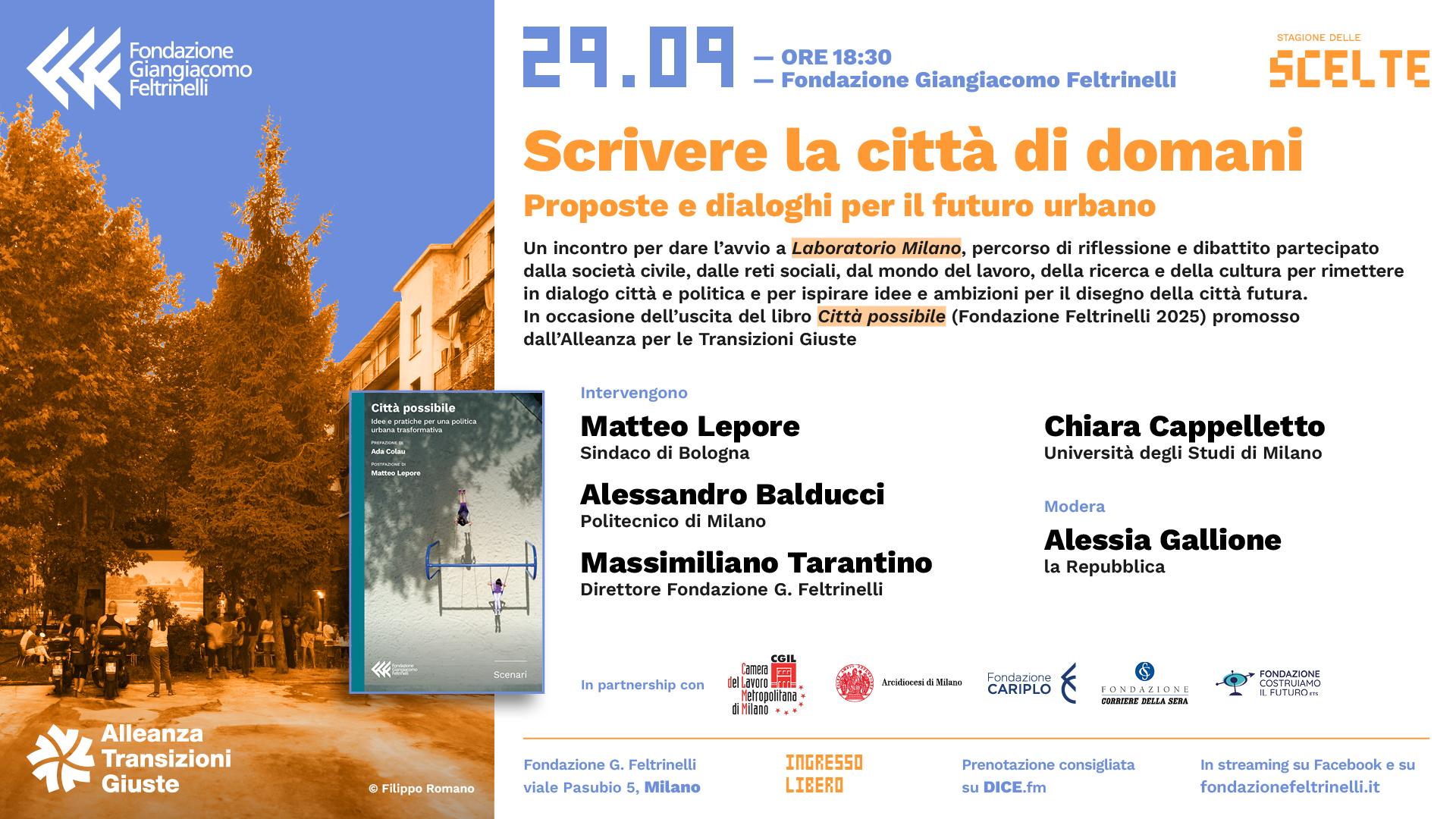 Si inizia lunedì 29 settembre ore 18,30 SCRIVERE LA CITTÀ DI DOMANI. Proposte e dialoghi per il futuro urbano. Una serata dedicata al confronto tra Sindaci, parti sociali, ricerca, cittadini e cittadine, in occasione dell'uscita del libro Città possibile. Idee e pratiche per una politica urbana trasformativa (Fondazione Feltrinelli e Alleanza per le Transizioni Giuste). Interverranno alla presenza dei partner di progetto: